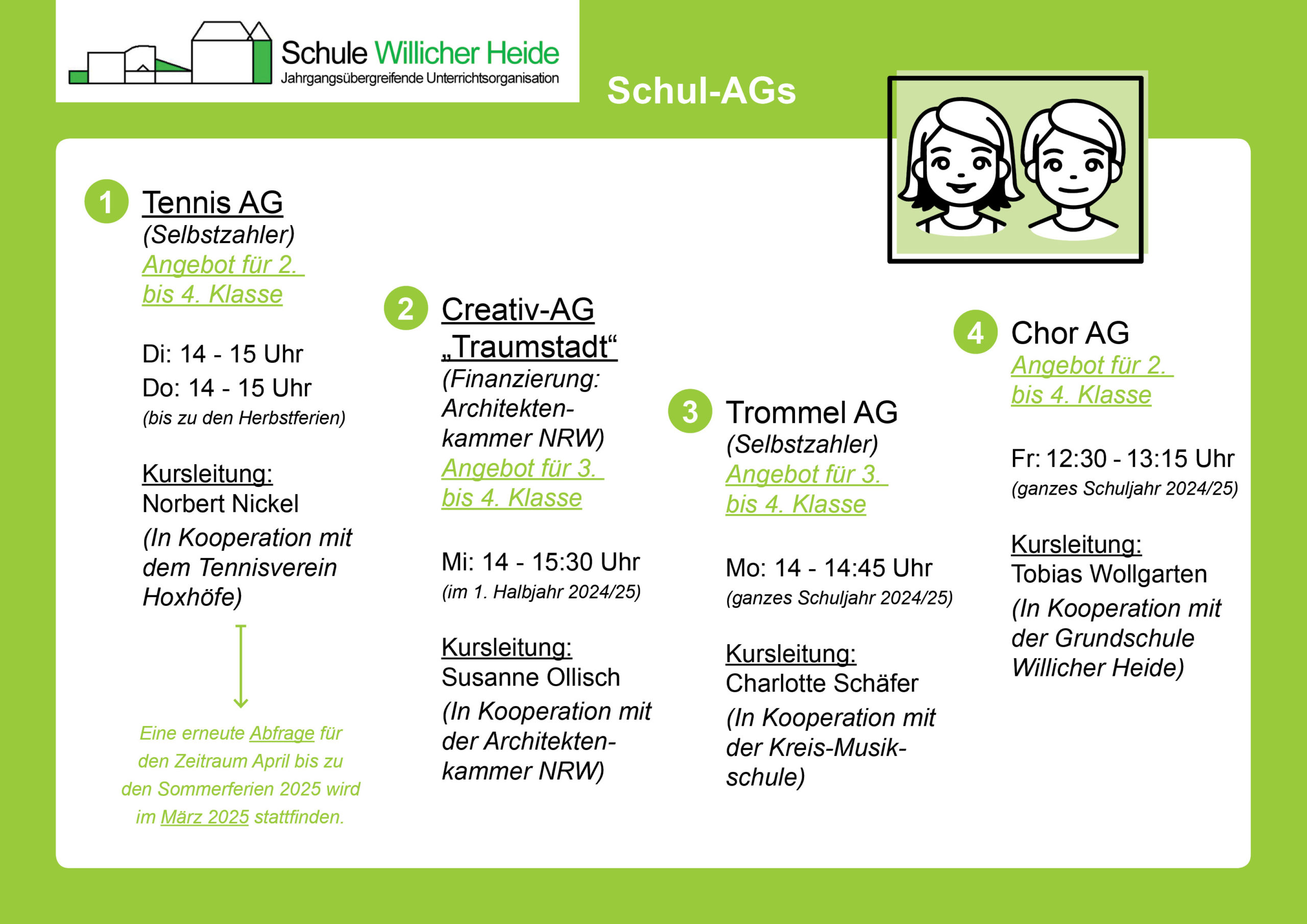 Deshalb werden von der Schule und der OGS viele AGs angeboten. Im Bild finden Sie eine Übersicht für die zusammengestellten Angebote im ersten Schulhalbjahr 2024/25 von der Schule. Eine Übersicht von der OGS wird noch folgen.